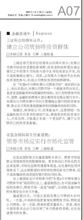 《中国证券报》2007年9月28日:证监会国际部主任童道驰:债券市场应实行市场化监管