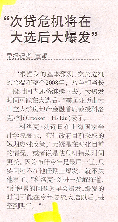 “根据我的基本预测,次贷危机的余温在整个2008年,乃至相当长一段时间内还将继续下去。大爆发时间可能在大选后。”美国亚历山大州立大学房地产金融首席教授科洛克·刘(CrockerH·Liu)表示。