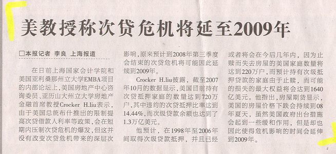 Crocker H.liu披露,截至2007年10月的数据显示,美国目前持有次贷抵押家庭的数量达到720万户,其中违约的次贷抵押比率达到14.44%,而次级贷款余额也达到了1.3万亿美元。