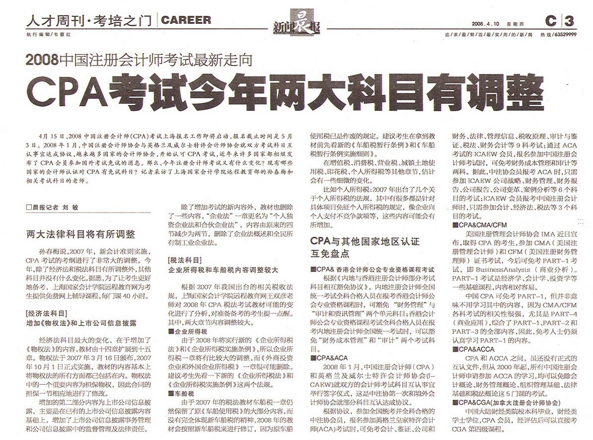 《新闻晨报》2008年4月10日:CPA考试今年两大科目有调整