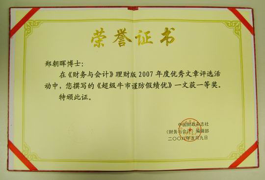 郑朝晖博士获《财务与会计》2007年度优秀文章一等奖