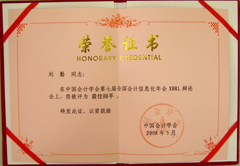 (通讯员:王双彦)在2008年5月的中国会计学会举办的第七届中国会计信息化年会XBRL辩论会上,我院刘勤教授被评为“最佳辩手”。
