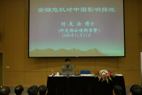 (通讯员:杨贵荣;摄影:姚凡、汪婷婷)11月25日晚,在学院一教200人报告厅举办了第65期沙龙讲座。本期沙龙讲座的主题是金融危机对中国影响,主讲人是外交部公使衔参赞刘友法博士。