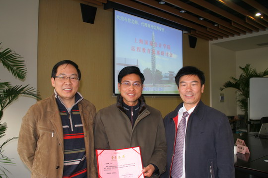 上海国家会计学院远程教育网主讲教师郑庆华、刘正兵与优秀学员合影(左:刘正兵,右:郑庆华)