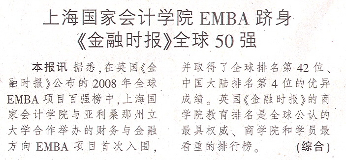 《中国会计报》2009年3月6日:上海国家会计学院EMBA跻身《金融时报》全球50强