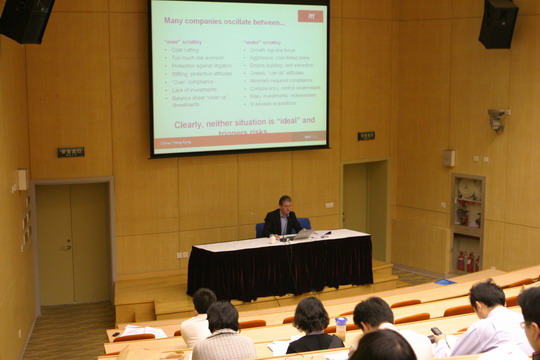 Mallett先生首先介绍了战略风险管理的基本框架及其与公司战略、公司治理的关系,并以英国北岩(North Rock)银行的困境为例阐述实施战略风险管理的积极作用,此外Mallett先生还就金融危机背景下广受关注的黑天鹅效应、各国应对危机的举措及效果等话题与在座学生做了深入交流和探讨,并且回答了现场学员的提问。(编辑:李泓)