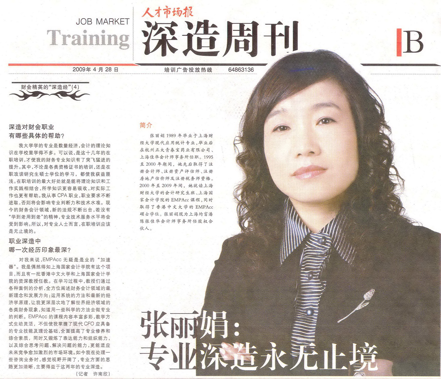 《人才市场报》2009年4月28日:张丽娟:专业深造永无止境