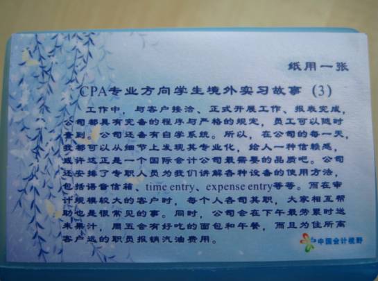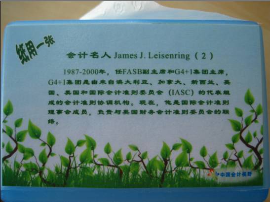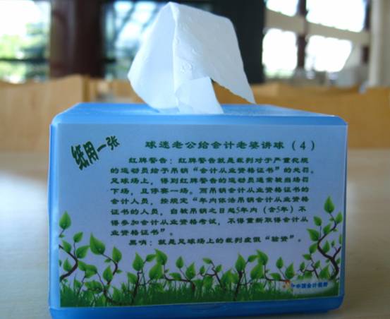学院餐厅的餐巾纸盒都穿上了“漂亮的外衣”。这些“外衣”是团委与中国会计视野网站共同合作的成果。因为以往发现,餐厅中的纸巾一直消耗很大,为了倡导用餐时节约用纸的理念,我们在模板上设计了“纸用一张”的字样,希望通过美丽的图片,丰富的知识、幽默的故事吸引用餐者的注意力,在丰富知识、放松心情的同时,使节约用纸的环保思想深入人心 。此前团委远程信息支部成员收集了 200 多条会计历史知识、会计名人简介、会计小故事、会计笑话,作为素材。(编辑:李泓)