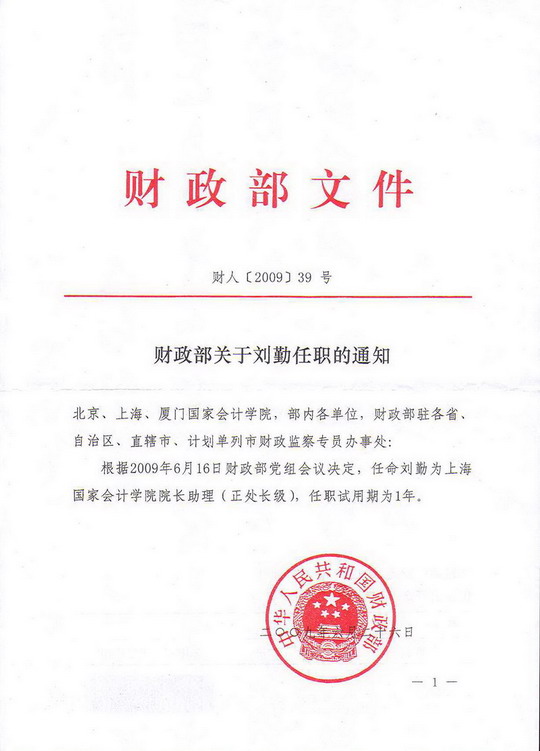 根据财人[2009]39号文件精神,财政部党组任命刘勤为我院院长助理,任职试用期为1年。7月31日上午,我院召开院务扩大会议,夏大慰院长宣读了财政部关于刘勤任职的通知,并通报了院党委对于刘勤同志的初步工作分工安排。院领导班子以及与会中层干部对刘勤同志表示了欢迎和祝贺。刘勤同志表示,非常感谢财政部领导及院领导班子的信任,在今后的工作中将以更加专注、执着的精神做好各项分管工作,不辜负部领导及院领导班子的信任,努力当好院领导的助手。