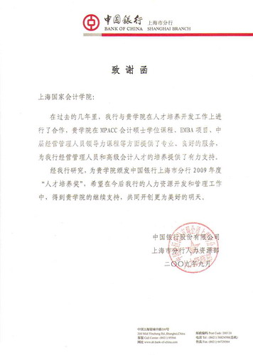 (通讯员:李泓)近日,中国银行上海分行向我院颁发了2009年度“人才培养奖”,并致函感谢。