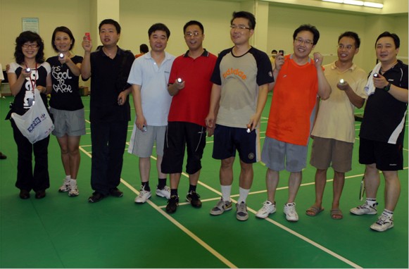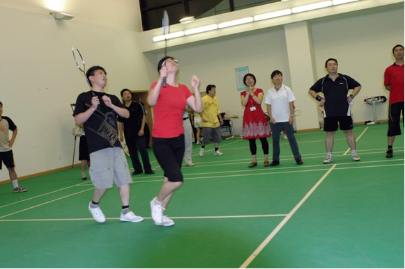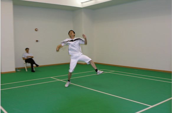 其余的组员在场边自发的组成了拉拉队,不遗余力地为各自的选手呐喊助威。一时间只听见掌声、叫好声、击打声响彻了整个羽毛球馆。