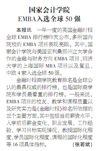 国家会计学院EMBA入选全球50强【《证券时报》2009年10月23日】
