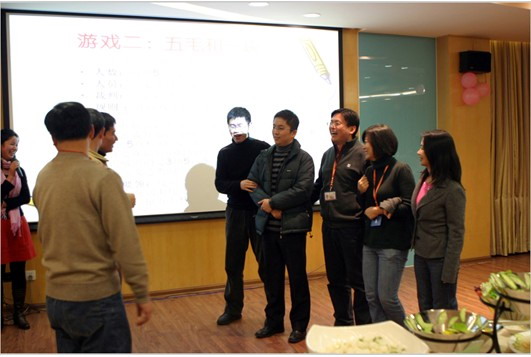 活动分两个环节,第一个环节是两个班同学分散坐,相互交流认识;大家在美妙的音乐声中,边吃着香喷喷的晚餐边高兴地和同桌同学聊天。第二个环节是游戏大比拼,每个班各选几名代表出来,