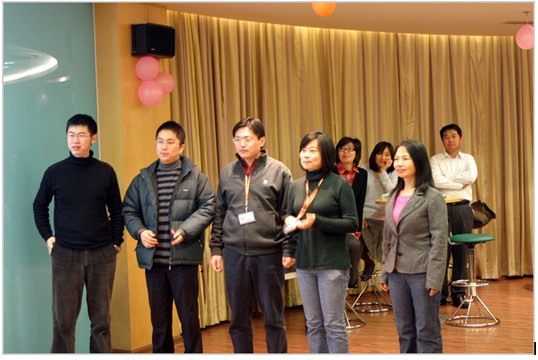 参加游戏。第一个游戏是七拼八凑,每组先选出一名接收者,手持托盘站在舞台上,其它小组人员按照主持人的要求提供物品放到托盘中,最先集齐物品的小组获胜。还没等傅秋莲老师讲完游戏规则,大家都争先恐后的举手要参加。您瞧,9期班的陈干锦班长和10期班的盛青同学跑到台前抢过托盘道具,担当起了游戏中的主角。