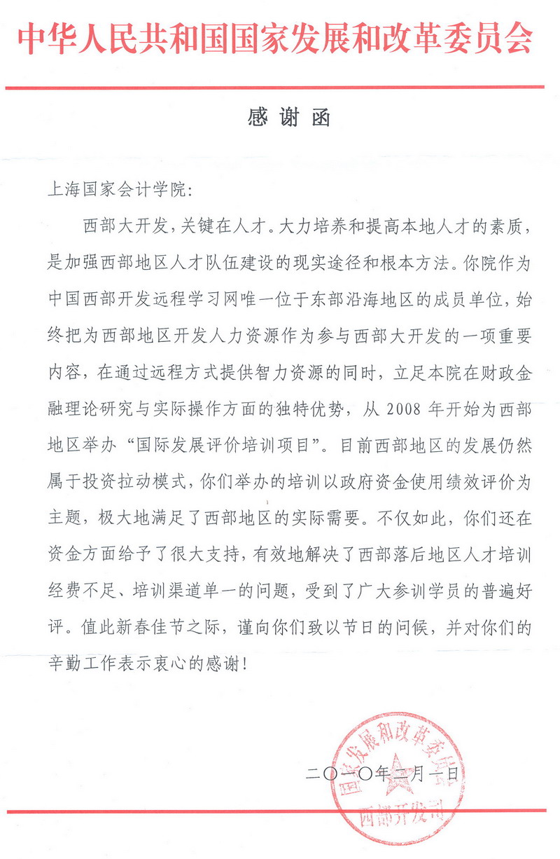 发改委西部开发司感谢函