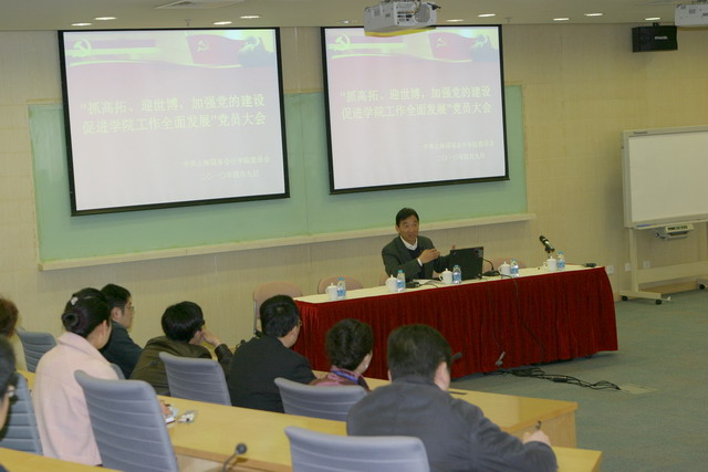 (通讯员:张各兴;摄影:曹巧波)当前,2010上海世博盛会召开在即,学院深化高端拓展的各项工作也正在积极地推动落实当中。为更好地发挥党员的先锋模范作用,抓住世博机遇,深入推动高端拓展工作,促进学院实现战略转型,4月9日,我院召开全体党员大会,对2010年党委的各项工作进行了动员和部署。学院党委书记、院长夏大慰发表了重要讲话,党委副书记、副院长李扣庆就2009年党委工作进行了总结并对2010年党委工作安排进行了总体部署,各支部分别派代表作了发言。会议还邀请了复旦大学文博学院朱顺龙教授介绍了世博会的有关情况以及本届世博会各展馆的设计理念。会议由党委副书记、院长助理刘勤主持。
