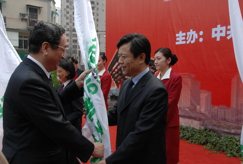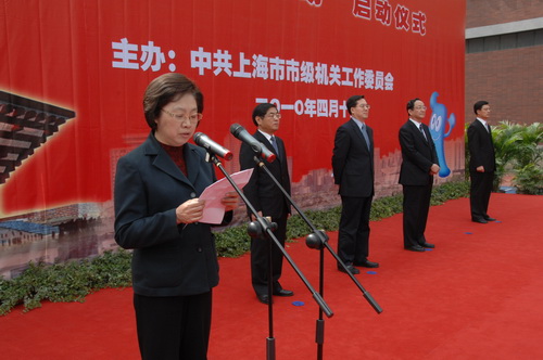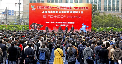誓师大会向全市党政机关和全体机关党员干部发出倡议,启动岗位行动、家园行动、志愿行动、应急行动、文明行动的活动,全力以赴奉献世博,切切实实当好表率。中共中央政治局委员、市委书记俞正声出席仪式并为志愿者队伍授旗。