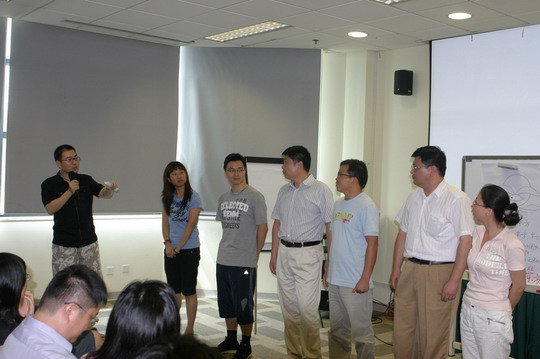 由于该培训班的学员来自不同的会计师事务所,所以彼此之间并不相识,甚至由于在公司不同的部门工作,来自同一会计师事务所的学员也有可能彼此并不是很熟悉。“抓住幸运,摆脱噩运”的抓手指游戏使得学员先与左邻右舍有了第一次的亲密接触。通过分组游戏叠罗汉,学员对于自己组内的同行有了初步认识,并在选举队长、选择队歌、确定队徽的过程中,产生了今后2年培训期的小组组长,并在小组长的领导下进行了第一次以小组为单位的集体展示。