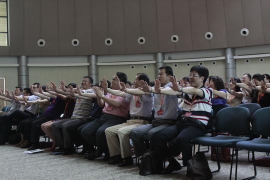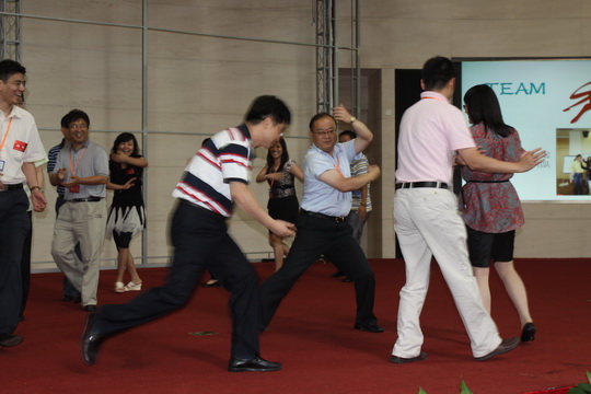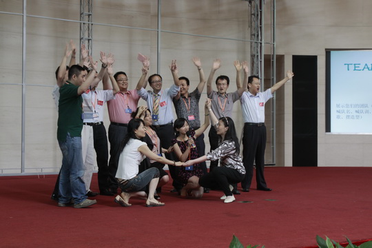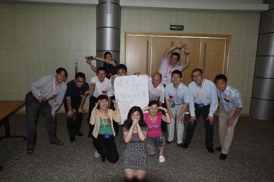 接下来,姚凡老师给大家做好团队分组,并布置了团队任务。各个团队按照要求选出了自己的队长,讨论了代表团队的队徽、队歌和代表动作。每个成员都很投入,大家热烈的讨论,各抒己见,每个人的思想智慧都融到讨论中来,每个好的创意、每个好的思路,都会激起其他人的共鸣和响应;“Team 秀”的时间到了,“山峰队”、“喜洋洋队”、“摩登霞光队”、“龙飞凤舞队”和“勇峰队”依次闪亮登场,自编的队歌、即兴的队舞,充分展现了各个团队在协作的基础上形成的成果。