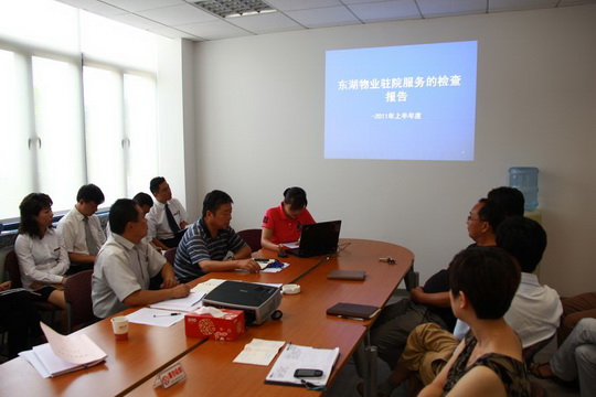 会议中,徐海涛、管海强和刘道林老师代表后勤部对东湖、锦江、园林等各家物业公司上半年的物业服务情况、取得的成绩和不足等进行了评述。各物业公司随后对如何针对考核中发现的问题在下阶段的工作中进一步提高服务质量进行了汇报。
