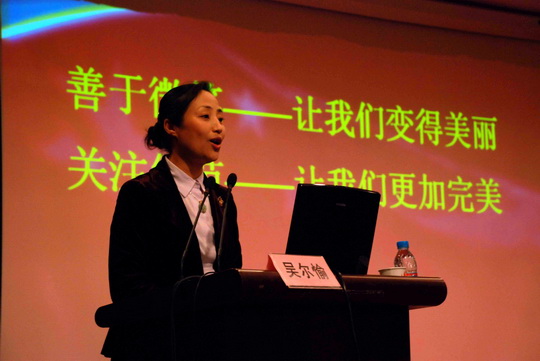 会议前半部分,东航上海航空公司主任乘务长、全国劳模吴尔愉作了题为“服务别人,提升自己”的演讲。气质优雅从容的吴老师曾是一名下岗的纺织女工,经过层层选拔成为空嫂正式上机时已32岁,她热爱自己的岗位,用真诚的微笑面对每一位乘客,设身处地为乘客着想,细心观察发掘乘客的需求,竭尽所能帮助乘客。空乘作为服务行业,面对形形色色的客人,难免会有各种突发状况,安抚航班晚点旅客的不满情绪,鼓励受刁难委屈满腹的年轻同事,化解乘客间的矛盾冲突,这一切在吴老师做来都那么的体贴自然令人信服。出色完美的工作不仅来自于她对自己的高标准严要求,更是对这个工作岗位的珍惜和热爱。善于微笑,不仅给乘客温馨服务,更是为自己创造了开心的工作环境。用微笑营造自己的工作环境,让自己开心投入地工作是吴老师给我们的启发,同样的工作用不同的心态去做,必然结果大相径庭。