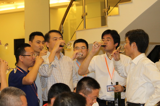每个小组到每个桌轮流的喝酒,相邻桌之间也在互动,有的聊工作,有的说笑话,还有的讨论作业……每个人的脸上都洋溢着灿烂的笑容,一切都是那么令人快乐和满足!