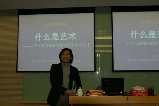 飘逸的中长发如云般潇洒,略显瘦削的身影尽显艺术家的风范,复旦大学上海视觉艺术学院美术学院副院长孙乃树教授在上午的讲座中,引领学员们走进艺术的神秘领域,探索艺术的妙趣横生。他以西方艺术为主线,从艺术观发展的角度讲述了从原始到现代主义的艺术演变过程,介绍了不同时期的艺术家、艺术作品、艺术风格和艺术流派,传授了艺术欣赏的基本方法。