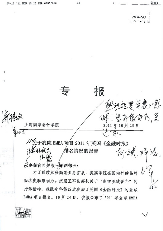 我院EMBA项目在2011年英国《金融时报》全球排名晋升到第20位、国内第3位。获此消息后,财政部王军副部长亲笔批示:热烈祝贺并衷心感谢!望再接再厉,更进一步。