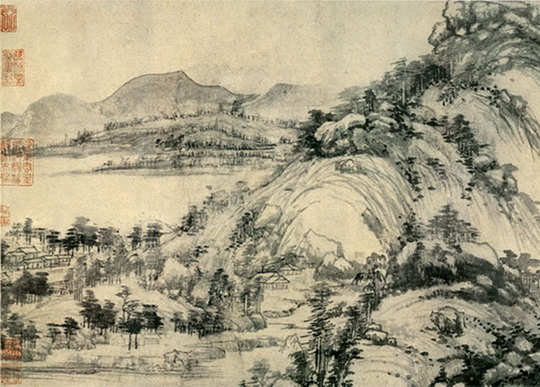 《富春山居图》用墨淡雅、线条怡然、山水布置疏密得当,展现了融人与自然之精气于山水笔墨之中的坦然和适切