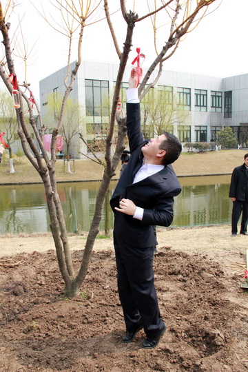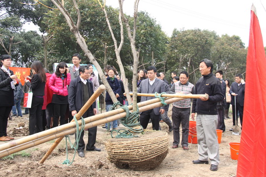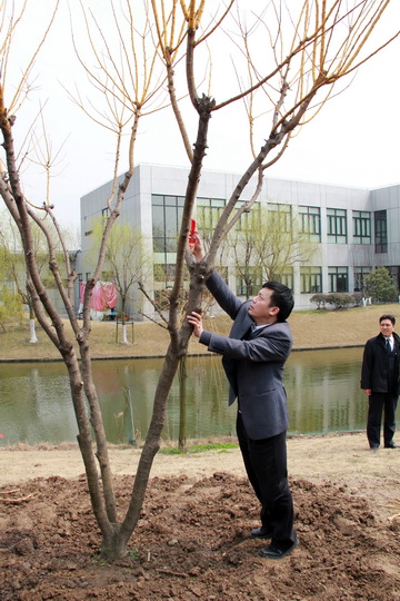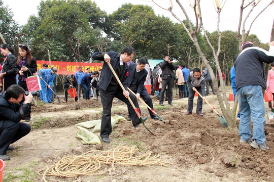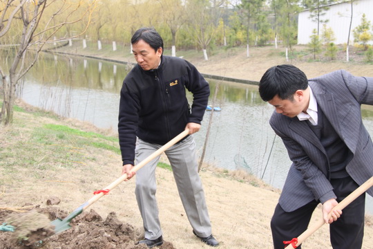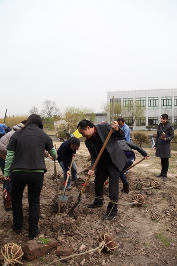 天公作美,在阴雨天连续不断的情况下,连续2天的晴朗天气带来了周四这个难得的植树好时机。上午10点30分,在夏院长的号令声中下,院领导共同种下了一颗“黄金万两”,之后全院员工马上投入忙碌的植树活动中,放眼望去,苗圃中人头攒动,各个部门老师有的挖坑,有的扶苗,有的铲土,有的浇水,相互配合干劲十足,好一派热火朝天的劳动景象。