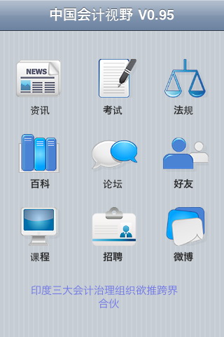 在中国会计视野网手机客户端上,用户不仅可以浏览会计资讯,参与网友互动评论,还可以获取最新的财经法规,了解学院的热门课程。客户端软件还创新性的将官方微博内置于软件,方便用户随时关注网站动态。客户端的推出,获得了视野网友的一致好评。