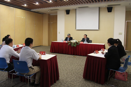 (通讯员、摄影:刘廷和)通过前期对申请者提供的资料和工作背景的初步细致审核,5月26日上午, EMBA项目办公室针对2012年EMBA项目第十期的申请者,安排了首批面试。担任面试官的是上海国家会计学院副院长管一民教授和亚利桑那州立大学凯瑞商学院副院长贝克伟教授。面试官主要通过开放式问题的讨论,重点考察申请者的逻辑思维能力、表达能力、领导才能、沟通技巧和发展潜力等项内容。