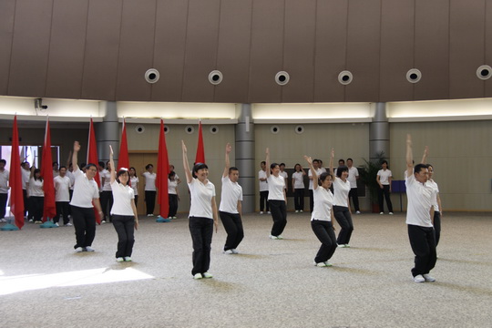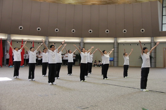 今年以来,学院各部门都面临着较大的业务增长压力,员工的工作压力也不断增加。在员工们开拓拼搏,无私奉献的同时,院领导也非常关心员工的身心健康。今年年初,夏大慰院长在学院工作会上提出要“加强员工身体锻炼、增进员工身心健康”。从年初开始,在院党委的指导下,学院工会、团委、女工委陆续开展了一系列文体活动,包括瑜伽、网球、羽毛球、太极拳、乒乓球和体育舞蹈等等,逐渐形成了校园文化建设“周周练、月月动”的喜人局面。这其中员工参与最广泛的就是第九套广播体操,每天上午10:00