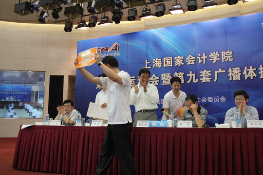 展示结束后,夏大慰院长宣布广播操比赛正式开始。各部门依次进入比赛场地,汇报两个月来学习广播操的成果。教研部、后勤部、AFDC 和行政财务部虽然人数不多,但是动作精准到位,精神头儿十足。教务部、研究生部、信息与远程教育部人数众多,但是动作都能整齐划一,远看蔚为壮观。每个部门表演完毕后,都会赢得其他部门热烈的掌声,大家已经忘记这是一场比赛,更多的是把做广播操当成锻炼身心,交流情感的生动载体。