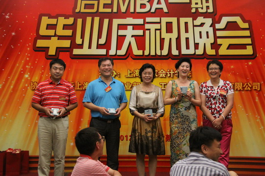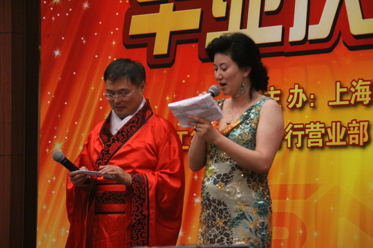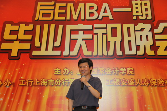 28日晚上,由学院主办,工行上海市分行营业部和工银安盛人寿保险有限公司协办的毕业庆祝晚会正式拉开帷幕。晚会由后EMBA一期程军和赵丽佳两位同学主持,二期副班长陈必昌同学、彭刚同学也特地赶来参加。