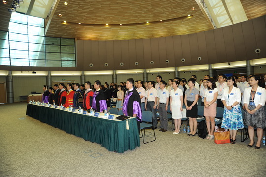 在庄严的国歌声中,毕业典礼拉开序幕。EMPAcc11期班级近70名同学身着硕士毕业服,出席了他们在学院学习生活中最重要的一刻。典礼由研究生部副主任颜延教授主持,上海国家会计学院院长李扣庆教授,谢荣教授,卢文斌院长助理,香港中文大学商学院院长黄德尊教授,香港中文大家会计学院院长杨丹青教授,范博宏教授,及李庆琦教授等参加了典礼。