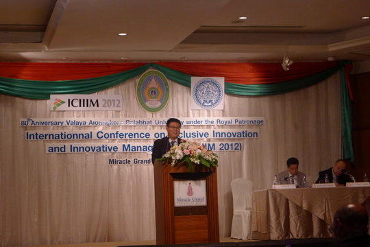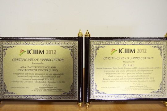 (撰稿:刘晓强)2012年“包容性创新和创新管理”国际大会(ICIIIM 2012)于12月14日至15日在泰国曼谷举办。此次大会由泰国国际发展合作部和瓦拉亚隆宫皇家大学合作举办,AFDC等九家机构协办。来自美国、日本、中国、印度、泰国等19个经济体约100名代表参与了大会,AFDC的吉瑞博士应邀参加大会。泰国信息与通讯技术部长阿努蒂•纳空塔代表总理英拉到会致辞,并为包括AFDC在内的各个合作机构颁发了纪念证书。