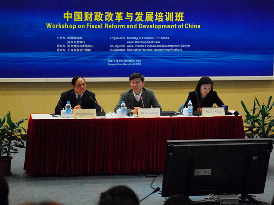 (撰稿:丁丽娟)为配合实施亚洲开发银行技援项目,进一步加强财政系统干部的能力建设, 财政部、亚洲开发银行与亚太财经与发展中心共同主办的“中国财政改革与发展”培训班(第一期)于3月28-29日在学院顺利举办。中心李扣庆主任、财政部国际司王莹调研员出席开幕式并致辞,共有来自全国各省、自治区、直辖市、计划单列市财政厅(局)的50多名处级干部参加了本次培训。
