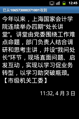 4月3日,市级机关短信推送平台发布了我院“处长讲堂”相关报道,短信推送到了上海市委市政府主要领导、市级机关系统所有单位的党委主要负责人以及党务工作者手机中,进一步增强了对我院的宣传效果。该短信推送平台2012年初建立,是上海机关党建交流的重要平台,发布信息门槛很高,备受各单位重视,此次发布我院“处长讲堂”信息也是我院党建信息今年首次在该平台发布。