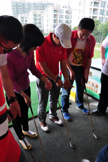 站姿、握杆、击球,大家认真地聆听着教练的讲解,丝毫不敢怠慢,深怕错过重要信息,可是依旧一知半解。实践出真知,大家通过练习来领悟高尔夫的动作要领。“嘭…”只见球杆在空中划出一道漂亮的弧线,重重地击打在地面上,却不见球飞出,虽然扑了个空,这却引得大家开怀大笑。