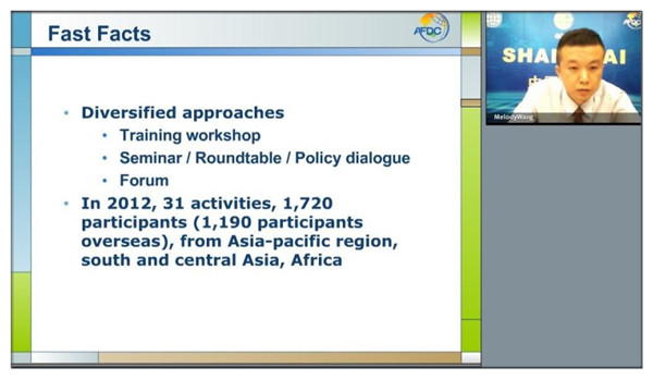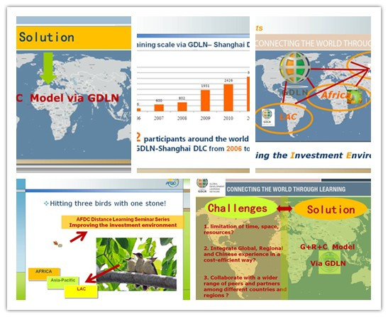 王颖在“利用GDLN促进知识分享与交流”部分,提出在当今世界是开放的、学习是连通的、全球化学习无边界的大背景下,AFDC作为一个可持续发展的能力建设机构,需要继续思考应对的三个挑战:“如何在全球化知识分享进程中克服时空和资源的限制?如何在一个知识分享活动中高效整合全球、区域与本国经验?如何在各国、各区域间开拓更加广泛多元的合作伙伴关系?”。应对这些问题,王颖介绍了AFDC在探索中构建的“基于GDLN的GRC模型”方案。通过对GDLN、上海远程学习中心以及GRC模型阐述,结合 “改善投资环境”首个跨区域合作项目的影响力和ADDIE教学设计模型,为各国能力建设机构分享了如何利用全球发展学习网络来扩大知识交流活动成效的新思路。