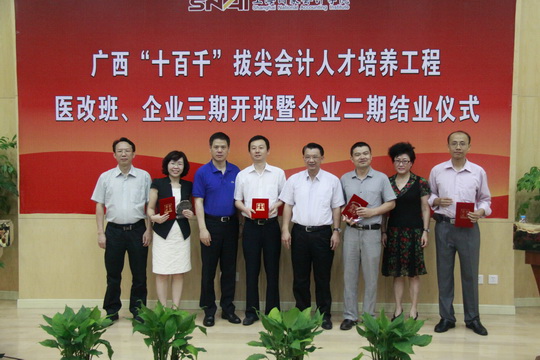 7月5日,来自广西各个行业的近160名学员参加了广西“十百千”拔尖会计人才培养工程企业三期与医改班开班、企业二期结业仪式。广西财政厅总会计师王代玉、学院院长助理卢文、广西卫生厅会计处处长龙莉莉等领导出席了此次典礼。教务部副主任刘凤委担任主持人。