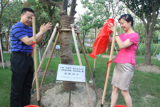 阶段结业在合影留念中画上圆满的句号。为了表达他们对母校的眷恋和不舍之情,全体学员为母校捐赠了一棵香橼树,寓意缘分,圆满,非常生动的表达了学员们能够从广西来到上海,相识相知成为挚友的这份缘分,并且在这里圆满的完成了60天集中培训。帅军平副书记和马丽娜副主任共同为捐赠树木揭牌。