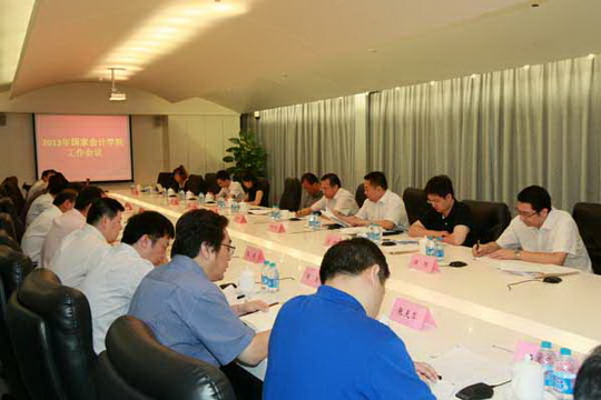 (撰稿:张涛;摄影:北国会)7月12日,2013年度国家会计学院工作会在北京召开。会议讨论并原则通过了国家会计学院章程和议事规则。北京、上海、厦门国家会计学院负责人分别介绍了学习楼继伟部长指示精神以及学院一年来的工作情况。财政部部长助理余蔚平出席会议并讲话。财政部人事教育司司长赵鸣骥通报了干部职工思想状况调查情况,张猛副司长主持会议。