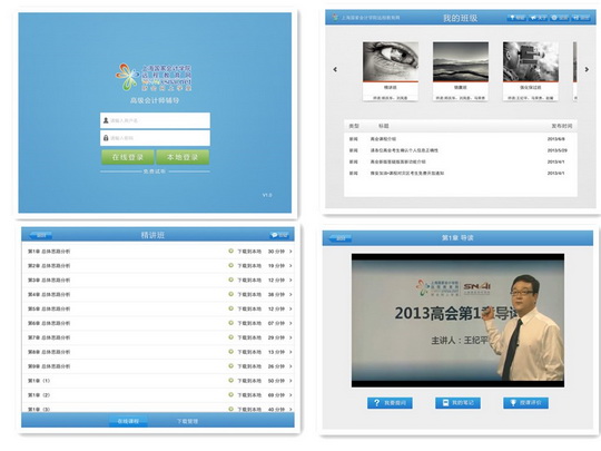 使用移动客户端,学员可以真正实现随时随地听课学习、提出疑问、查看课件、了解进度。还可以在没有网络的情况下,使用“本地登录”功能学习已下载的课程。未注册的用户,可以通过“免费试听”功能了解我院课程。