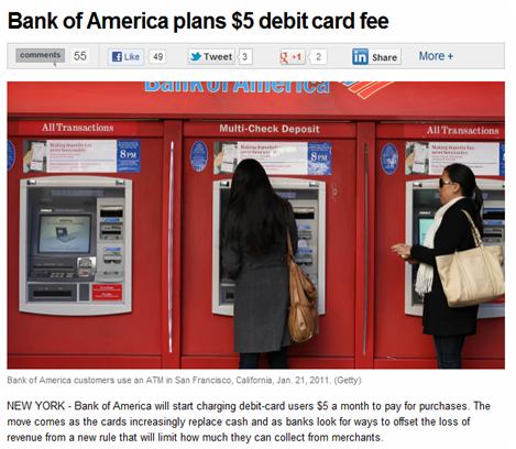 总部位于北卡罗来纳州夏洛特的美国银行曾准备向现金卡用户征收每月5美元的交易费。此举源于现金卡的大量使用取代了现金支付,同时也是银行在寻求途径弥补因新规则的实施导致商家回款减少所带来的损失。然而这一举措使得客户们忿忿不平,莫莉•卡契波尔就是其中一位。这位22岁的华盛顿居民在网上发起了联合署名活动,抗议美国银行收取5美元月费的计划。结果一呼百应,一周内就有10万人签名赞成,一个月后,网上多达30万人响应此举。最终美国银行被迫取消了5美元月费。