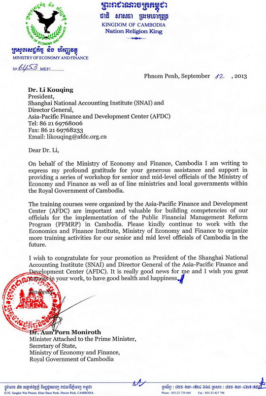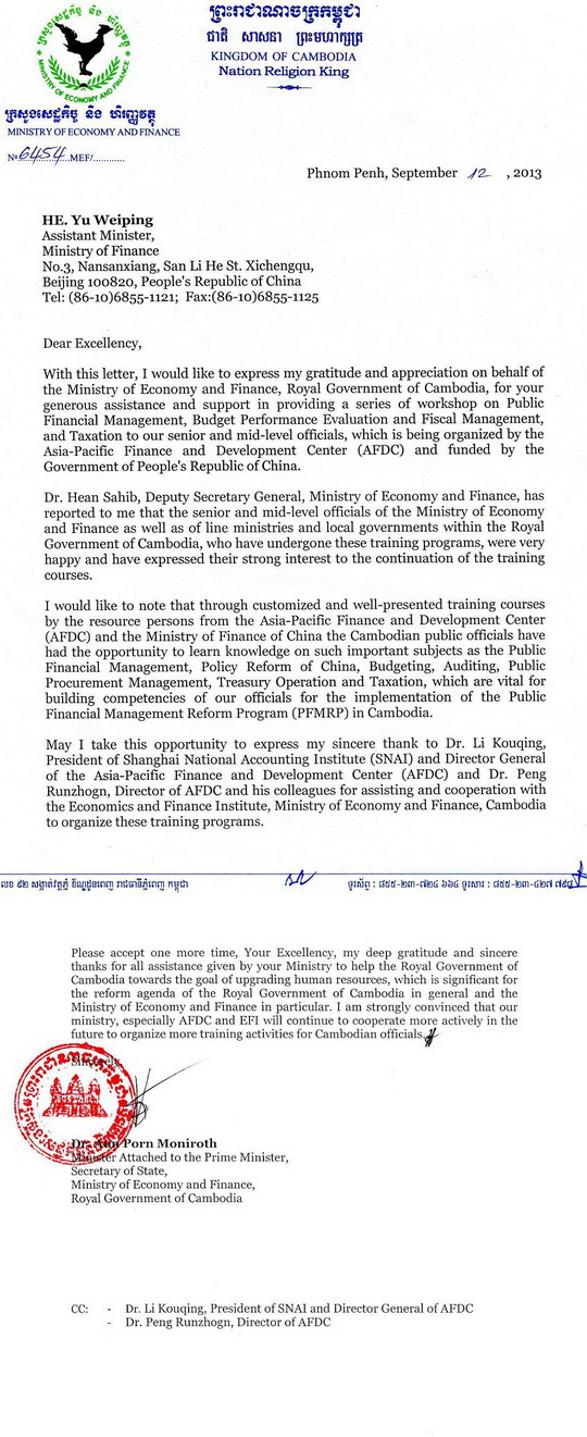 近日,AFDC收到柬埔寨经济财政部国务秘书Aun Porn Moniroth博士分别致余蔚平部长助理和李扣庆院长的感谢信。