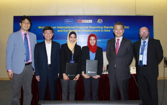 ADBI能力建设和培训中心邢予青主任(左一)、国际会计准则理事会(IASB)张为国理事(右一)和AFDC李扣庆主任(中)