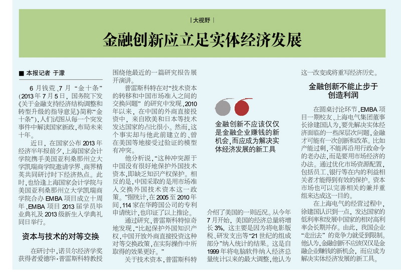 他认为,金融创新不应该仅仅是金融企业赚钱的新机会,而应成为解决实体经济发展的新工具。