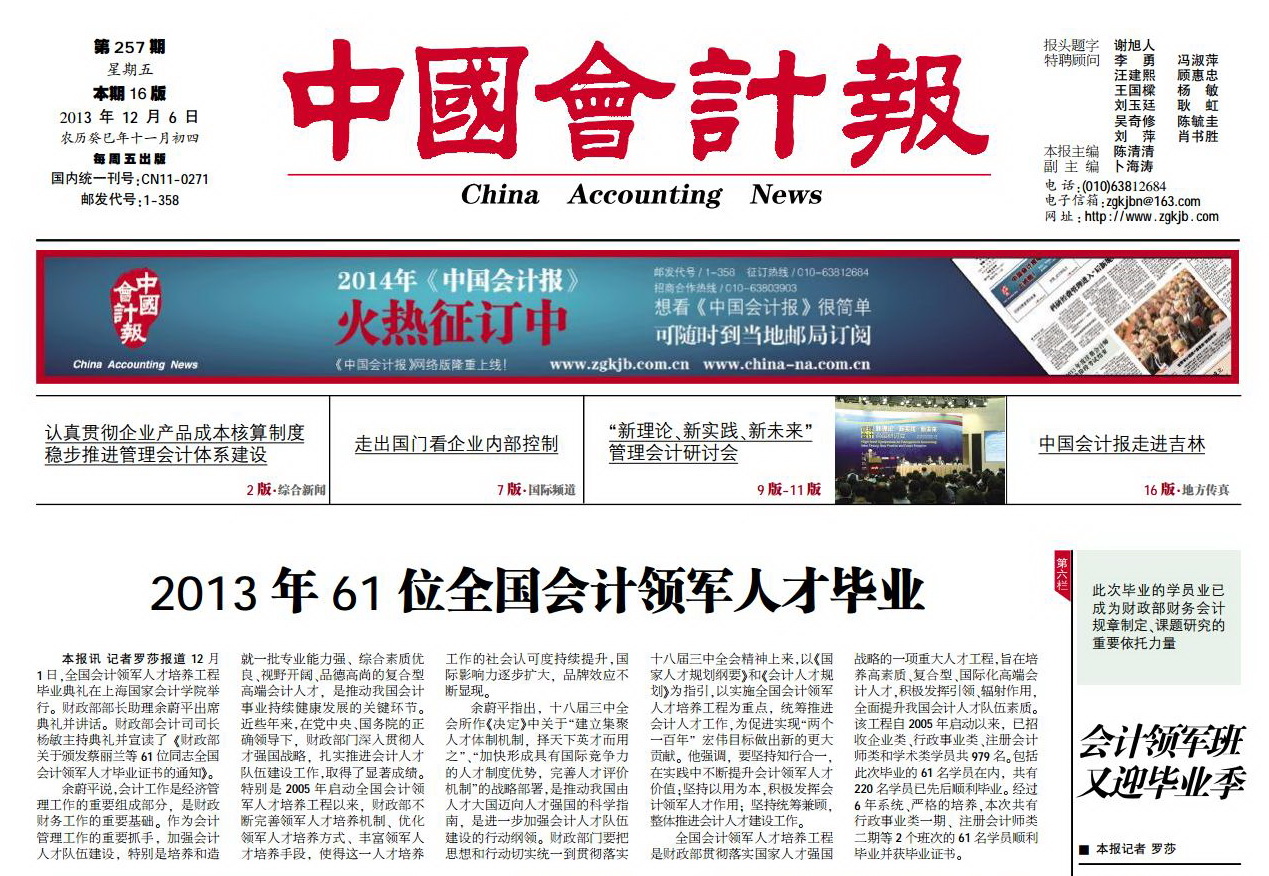 2013年61位全国会计领军人才毕业【中国会计报,2013年12月6日】